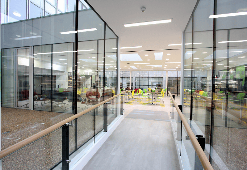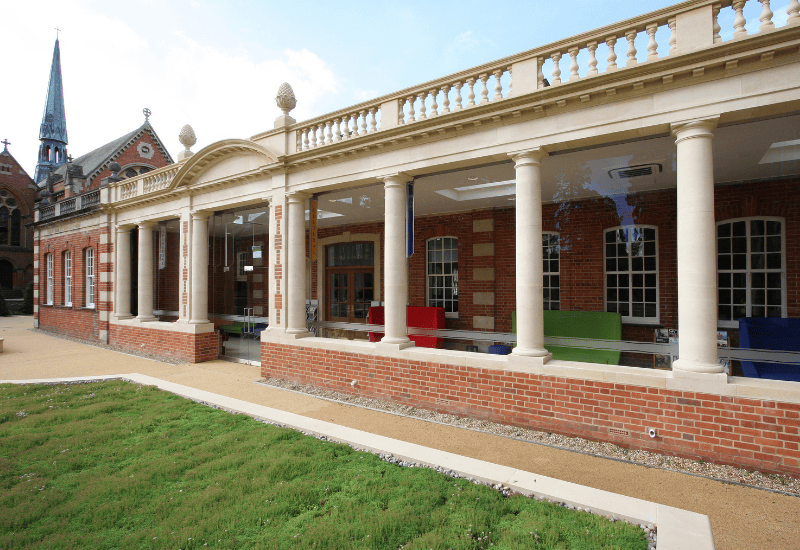 More advanced specialist glasses can also be used in glass façade designs. Anti-reflective glass was used within the glass at Wellington College. Anti-reflective glass sits in-between the stone pillars of the walkway at the listed school. The resulting glass is almost invisible and does not change the appearance of the listed school.