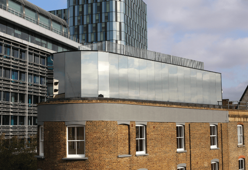 The glazed lecture hall on King Charles Street has a slightly tighter curve to the glass façade. As the glass was on the ground floor and only one storey, the glass thickness required was less which allows for a tighter curve to the glass façade.