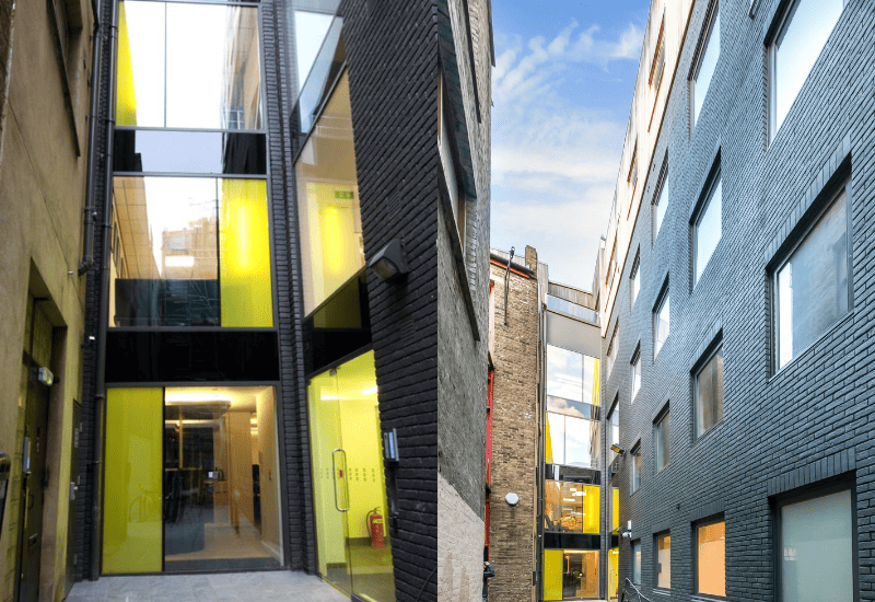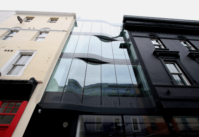 In contrast, Rivington Street is a narrow glass façade design created using structural glass across multiple floors. The glass façade was designed as part of a three storey office refurbishment in Shoreditch. Frameless clear glass mixed with coloured glass to create the unique and colorful glass façade.