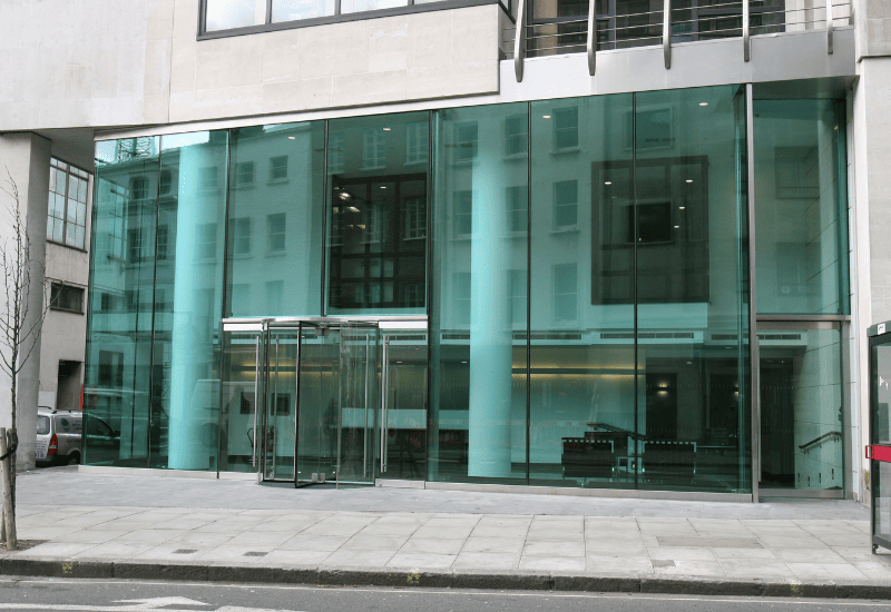 This glass façade in London used a double height structural glass façade to create the office front. The 6m tall glass units included a solar control coating to protect the interior of the reception from overheating.